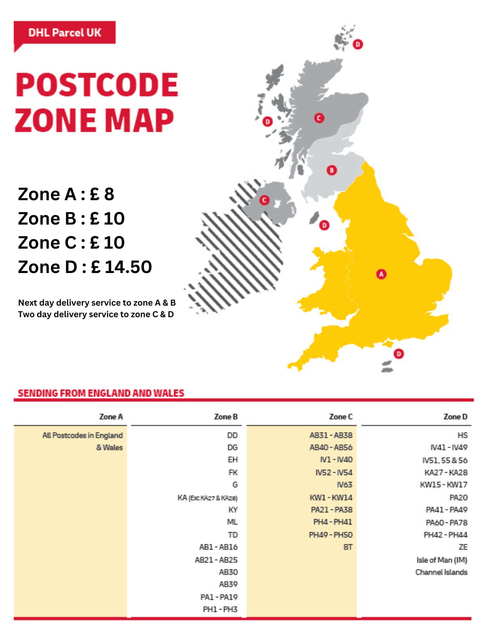 We ship parcels via DHL courier using the Next Day Delivery Service. Please note that this service applies from the moment the parcel is dispatched, not from the day the order is placed.